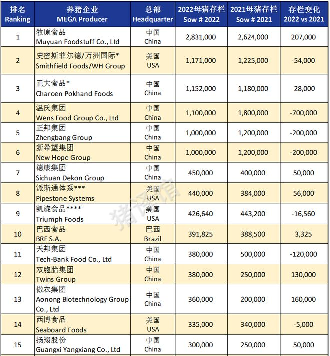 中國曆(lì)來是養豬(zhū)大國,但(dàn)大到什麽(me)程度(dù),99%的小夥伴不知道。本年度的(de)全球養豬企業排行榜(母豬存欄10萬頭及以(yǐ)上)有42家公司上榜,分別來自9個國家,其中(zhōng)中國19家,占比42%,新上榜4家,分別是海大集團、鐵騎力士集團、廣西桂墾牧業和深圳(zhèn)金新農(nóng);美國11家,與2021年一致。巴西4家,西班(bān)牙和俄羅斯各2家,法國、智利、泰國和加拿(ná)大各1家(jiā)。中國、美國和巴西包攬了排名前20的所有企業。
