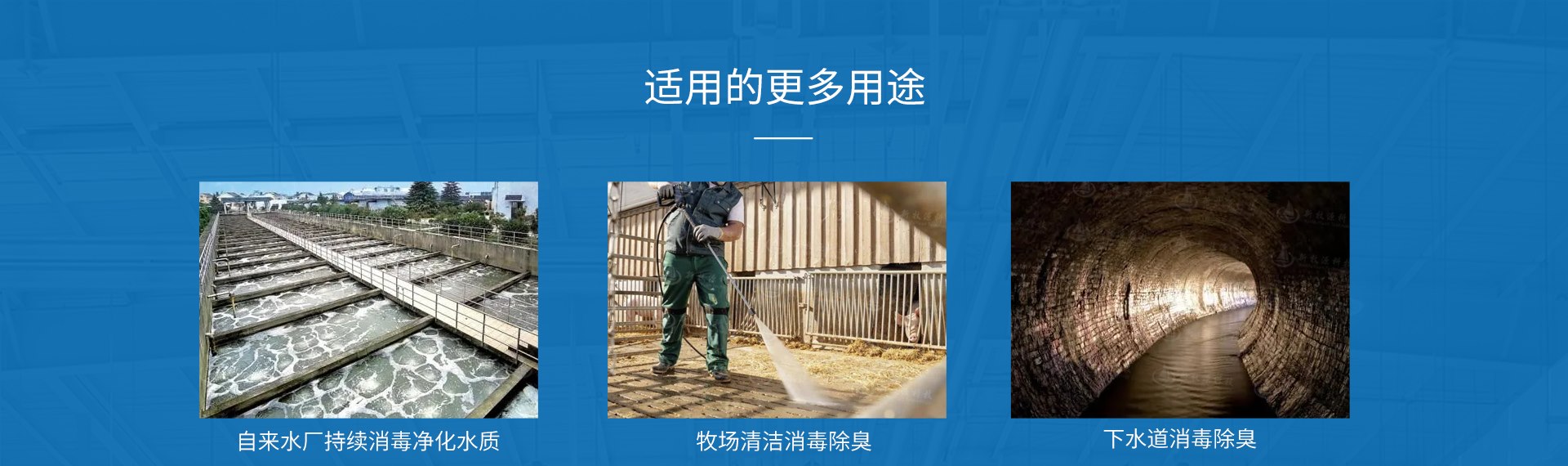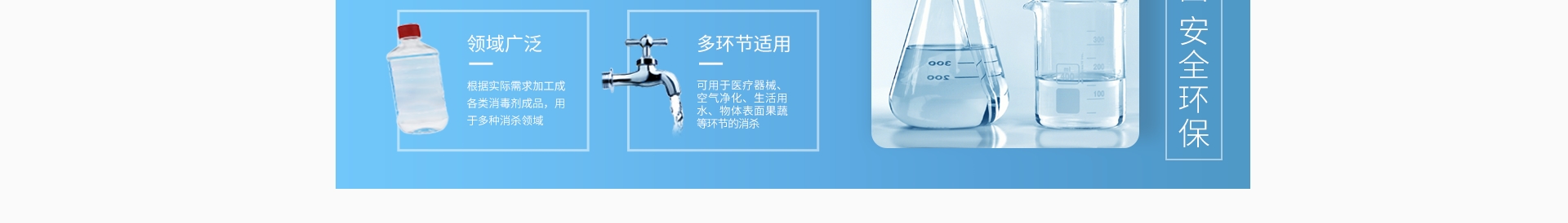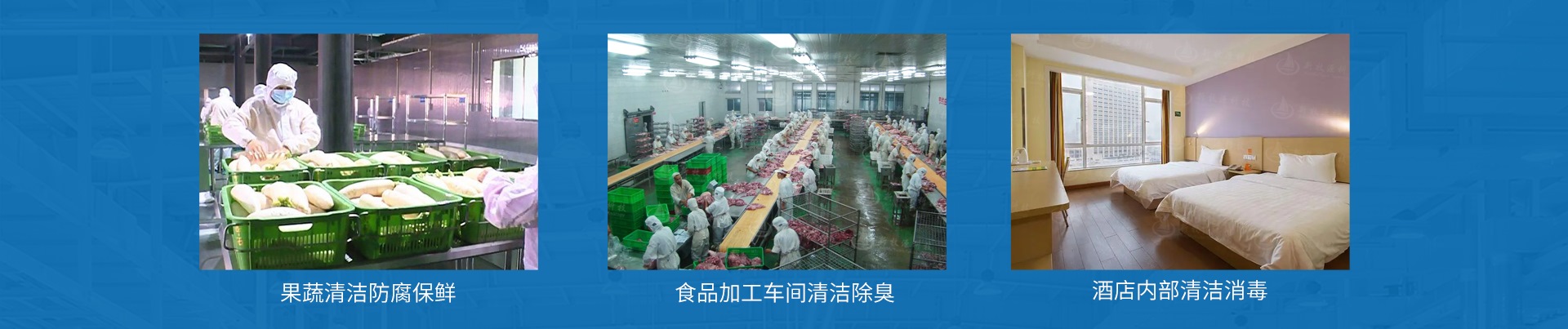 具有安全、環保、廣泛、快速、高效殺菌、不用二(èr)次衝洗,成(chéng)本低廉,低殘留,不會產生有害物質,使(shǐ)用後可直(zhí)接(jiē)排放等優點。可廣(guǎng)泛應用於食品加工、農畜牧、水產、大型超(chāo)市、中央廚房等行業。
